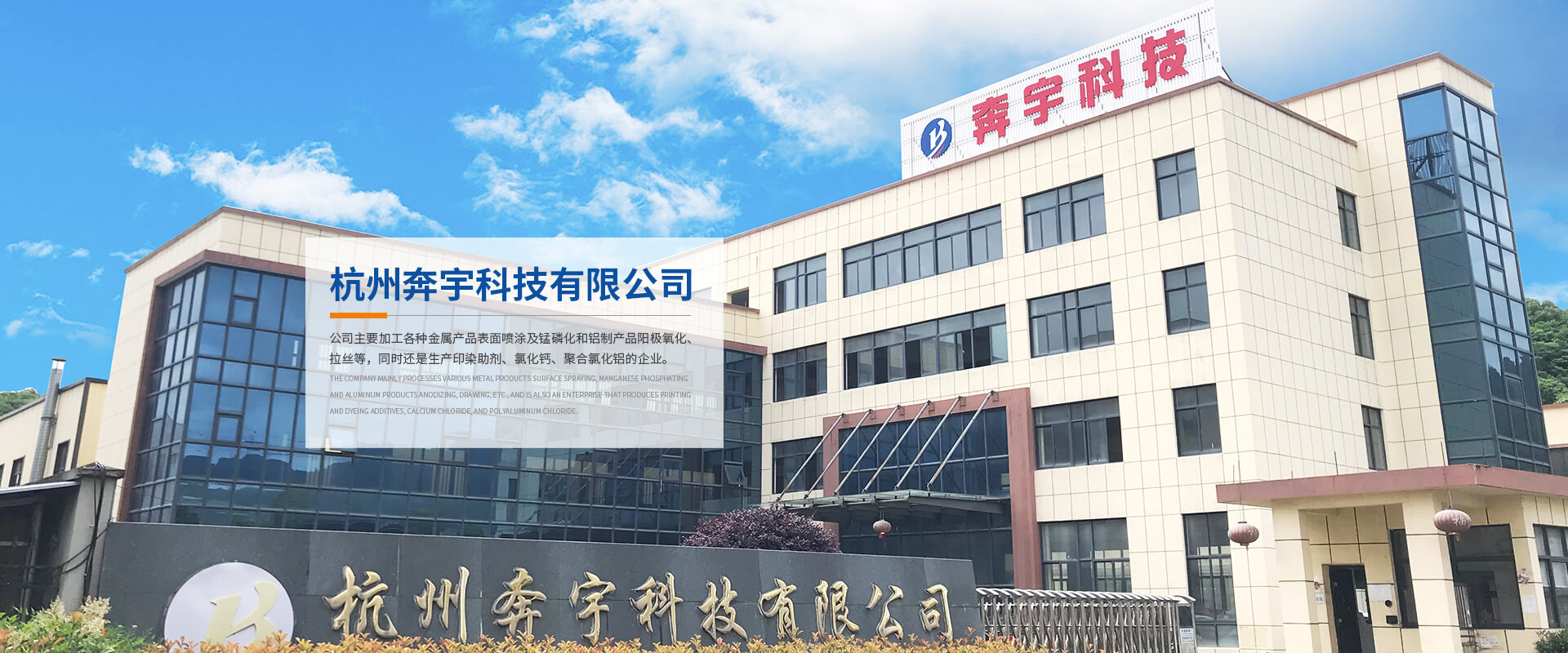 杭州奔宇科技有限公司,是一家有著十幾年輝煌歷史、實力雄厚,并依托當地高校不斷開展技術革新的民營加工生產企業。公司主要加工各種金屬產品表面噴涂及錳磷化和鋁制產品陽極氧化、拉絲等,同時還是生產印染助劑、氯化鈣、聚合氯化鋁的企業。